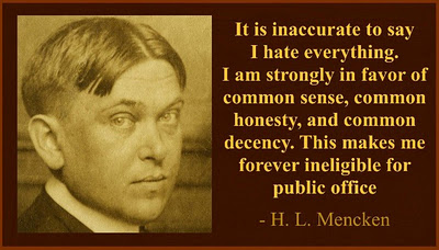 “Democracy gives the beatification of mediocrity a certain appearance of objective and demonstrable truth. The mob man, functioning as citizen, gets a feeling that he is really important to the world—that he is genuinely running things. Out of his maudlin herding after rogues and mountebacks there comes to him a sense of vast and mysterious power—which is what makes archbishops, police sergeants, the grand goblins of the Ku Klux and other such magnificoes happy. And out of it there comes, too, a conviction that he is somehow wise, that his views are taken seriously by his betters — which is what makes United States Senators, fortune tellers and Young Intellectuals happy. Finally, there comes out of it a glowing consciousness of a high duty triumphantly done which is what makes hangmen and husbands happy.”