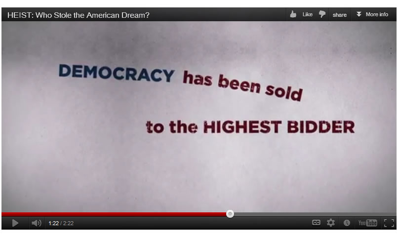 "HEIST: Who Stole the American Dream? is stunning audiences across the globe, as it exposes the real truth behind the worldwide economic collapse, tracing its origins to a 1971 secret memo entitled Attack on American Free Enterprise System. Written over 40 years ago by the future Supreme Court Justice Lewis Powell, at the behest of the US Chamber of Commerce, the 6-page memo, a free-market utopian treatise, called for a money fueled big business makeover of government through corporate control of the media, academia, the pulpit, arts and sciences and destruction of organized labor and consumer protection groups.