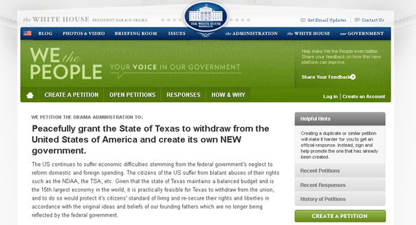 "The Texas petition leads all others by a wide margin. Shortly before 9:00 a.m. EST Wednesday, it had attracted 94,700 signatures. But a spokesperson for Gov. Rick Perry said Tuesday afternoon that he does not support the idea of his state striking out on its own.