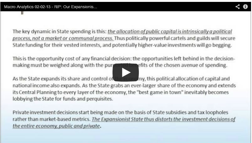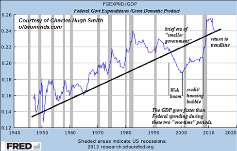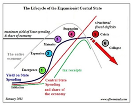 What historically kills the expansionist state beast, is when debt reaches the critical point of debt saturation. This is the point where government borrowing is so pervasive that it forces total debt to grow to enable it to leverage ever smaller growth levels of an economy captured by a debt stranglehold brought on by the expansionist central state. The structural imbalance of state expenditures and revenue leads to structural deficits. This is the situation the US presently finds itself in, and is to be fully expected, when the central state is allowed to assume a larger expansionist role. Like a cancer it will insidiously and relentlessly expand unless operated on. The sooner the operation the better the chance of survival.