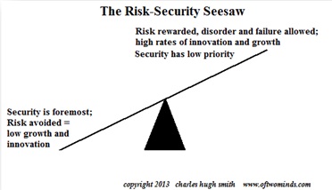 What is often forgotten is that within a capitalist system and a free society, there is a balance of risk versus security. This is one of the central reasons "socialism" eventually fails. Risk cannot be eliminated; it can only be suppressed or transferred to others. If you want growth, you must reward risk and innovation and foster a culture that accepts failure and low-intensity disorder as the norm. The public cannot expect the false state promises of security without fully recognizing that it will kill risk taking, innovation and growth and foster the crony capitalism feeding off the less risky public trough. Expansionist central states ALWAYS make promises it has no ability to deliver on without effectively 'killing the golden goose'.
