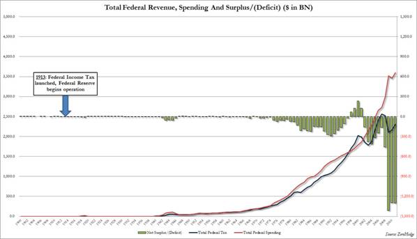The gradual slide towards our national bankruptcy of wealth, spirit, freedom, self-respect, morality, personal responsibility, and common sense began in 1913 with the secretive creation of the Federal Reserve and the imposition of a personal income tax. Pandora’s Box was opened in this fateful year and the horrors of currency debasement and ever increasing taxation were thrust upon the American people by a small but powerful cadre of unscrupulous financial elite and the corrupt politicians that do their bidding in Washington D.C. The powerful men who thrust these evils upon our country set in motion a chain of events and actions that will undoubtedly result in the fall of the great American Empire, just as previous empires have fallen due to the corruption of its leaders and depravity of its people. Creating a private central bank, controlled by the Wall Street cabal, and allowing the government to syphon the earnings of workers through increased taxation has allowed politicians the ability to spend, borrow, and print money at an ever increasing rate in order to get themselves re-elected and benefit the cronies, hucksters and bankers that pay the biggest bribes. None of this benefit the average American, who sees their purchasing power systematically inflated and taxed away. This is not capitalism and it is not a coincidence that war and inflation have been the hallmarks of the last century.