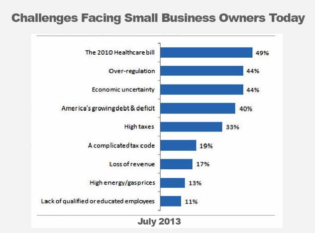 Though the economy still makes it a rough slog for many business owners, they state that their biggest challenge is Obamacare as seen in the chart below.