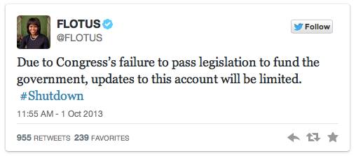 So, after the first twenty-four hours of a US government "shutdown" what has happened? Perfectly fine roads have been blocked from access, nice fields have been closed off so you can't use them, the USDA has written a message on their active web servers that their website is offline and Michelle Obama has warned her tweets might be limited!