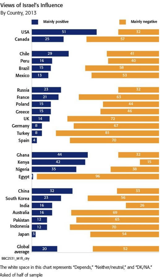 So my fellow Americans will probably be surprised to learn that the U.S. is more or less the only country in the world which has a favorable view of Israel.