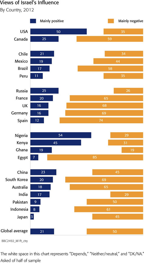 Specifically, a 2012 BBC poll found that the U.S. and Nigeria were the only countries of those polled in which the majority of people had favorable views of Israel: