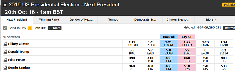 | 30th Sept | 9pm | 1.39 | 3.75 | Accelerating meltdown of Trump odds |