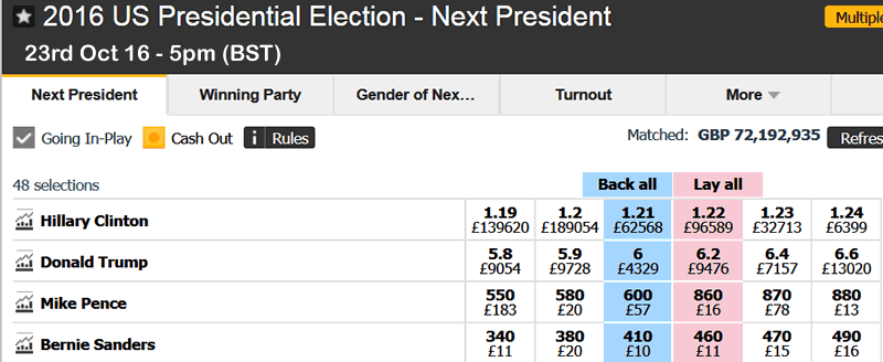 | 30th Sept | 9pm | 1.39 | 3.75 | Accelerating meltdown of Trump odds |