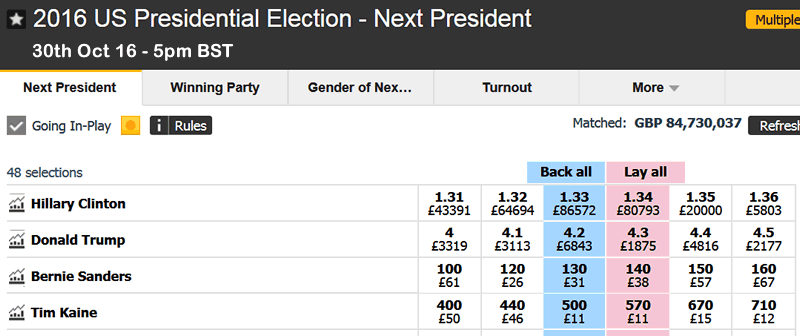 | 30th Oct | 5pm | 1.33 | 4.2 | Trump Hillary Emails boost. |