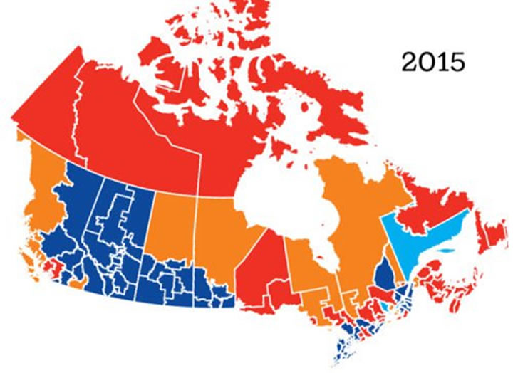 2015 Election Results by Riding (Blue Conservative/Red Liberal/Yellow NDP [socialist])