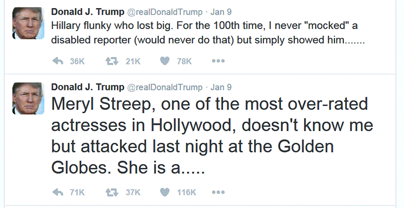 The Golden Globes sparked another twitter tirade from President Elect Donald Trump following criticisms from Meryl Streep for Trumps mocking of a disabled reporter during the election campaign -