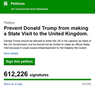 Given that muslim UK passport holders are also banned from entry to the US then a new petition has sprung up seeking to cancel Trump's state visit to the UK summer 2017, that has also aready passed 600,000 signatures and likely to pass the 1 million mark within a few hours