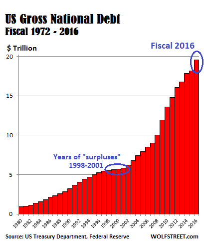 Still, none of it is unexpected. The Automatic Earth has been saying for years, and with us quite a few others, that this was and is inevitable. Of course there are those who say that we cried wolf, but we’ll take that risk any day. Saw a nice very short video of Mike Maloney saying in 2011 that Obama would have to double US debt between 2008 and 2016 just to keep the entire system from starting to collapse, running to stand still, Alice, Red Queen and all. And guess what?