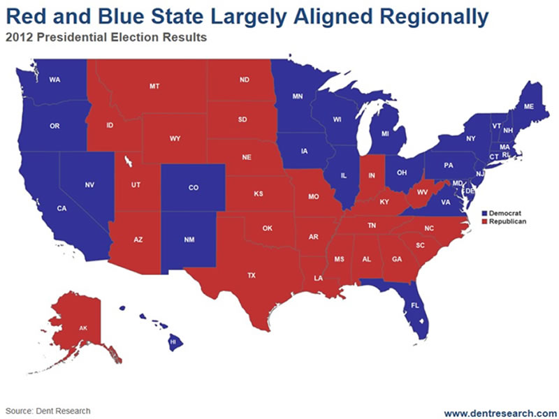 Here’s the map of the red/blue states, from the 2012 presidential election, that I showed in that issue.