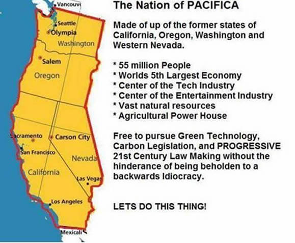As the consequences of losing control of the federal government seeps into their delusional entitlement, the ultimate statists of the Left scamper to find a method to regain power. A concept, whose day is gaining acceptance, is the Nation of Pacifica. With the incompatibility between the Trump Nation deplorables and the intolerant collectivists of Leftist state worshipers, the end game is rapidly approaching a final conflict that easily could erupt in a real civil war. Leave it to the beautiful people; their fantasia screen play scripts a peaceful dissolution of the disjointed union. A sample of their dialectic: