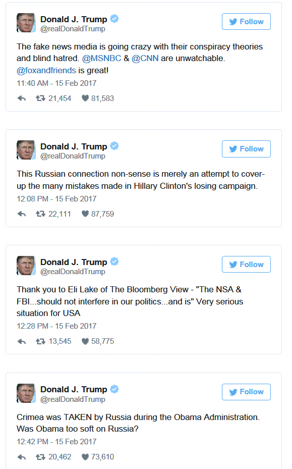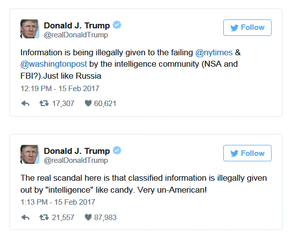 President Trump once more was forced to respond the criminality of the intelligence agencies leaking classified material to the press and thereby committing treason against the Office of the President of the United States.