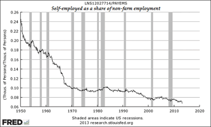 The percentage of people who are business owners relative to the overall employed population, is at an all time low.