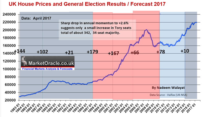 The need to remember that the house prices wealth effect is the MOST accurate forecaster for outcomes of UK general elections i.e. April data implied 342 Tory seats, whilst data for May released on 7th June implied just 334 Tory seats! By far the most accurate predictor. So house prices's analysis should be tasked as being of primary importance ahead of ALL other analysis. Getting an accurate gauge of house prices trend and momentum going into polling day is the key towards arriving at an accurate forecast conclusion, everything else should be secondary.