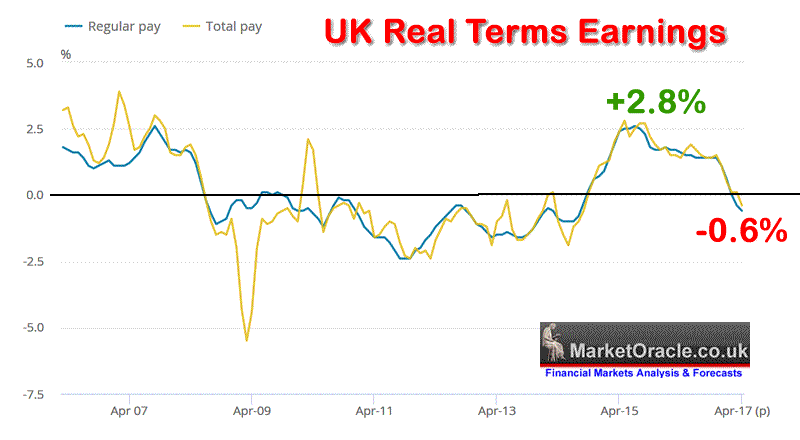 Again it is necessary to undertake economic analysis for instance to answer questions such as are incomes rising or falling in real terms for how do voters feel about their personal circumstances. Where whilst in Mid 2015 real terms earnings were rising at the rate of 2.8%, i.e. the previous Chancellor George Osborne of timing the peak in earnings for the May 2015 general election. However this time Theresa May called the election for a time when the earnings had turned negative, a huge mistake.