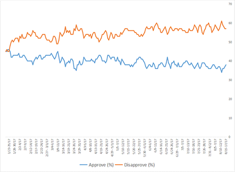 President Trump’s job approval was relatively highest when he arrived in the White House last January, when 45 percent of Americans still believed he would do a good job, and another 45 percent did not. Thereafter, Trump’s performance has eroded. Today, almost 40 percent of Americans approve his performance but nearly 60 percent do not (Figure 1). These results are actually more moderate than those of President Obama. When he arrived in the White House in 2009, most Americans had faith in him; when he left, he had lost almost half of his political capital.