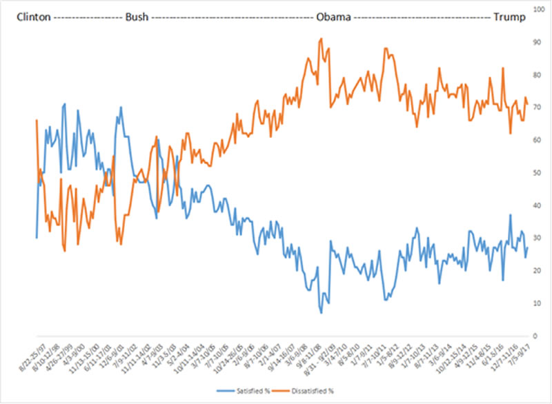 America’s deep polarization originates from the neoconservative wars against Iraq, Afghanistan and the War on Terror, which have divided the nation ever since. It peaked in the end of the George W. Bush era and the beginning of the Obama rule, when nine of ten Americans disapproved the direction of the nation. Even in mid-2016, toward the end of the Obama era, more than 80 percent of Americans disapproved that course. Today, a year later, more than 70 percent of Americans disapprove the course of the nation (Figure 2).