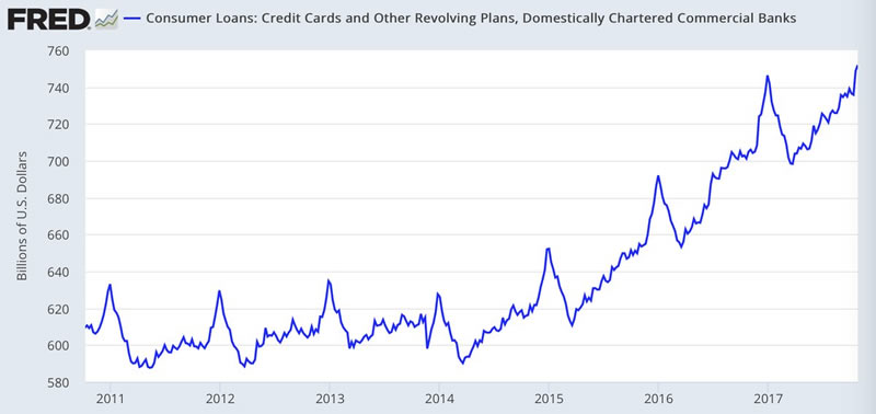 In reality, recognizing a true inflation rate of at least 5%, the average worker has seen their real wages decline by 5% over the last two years. This brings us back to the chart above. Credit card and other revolving debt has increased by 20% since the beginning of 2015. The Deep State narrative would describe this phenomena as a huge positive (more interest and fees for the criminal Wall Street cabal) because it proves average Americans are optimistic about the future. Consumer confidence has never been higher. Right?