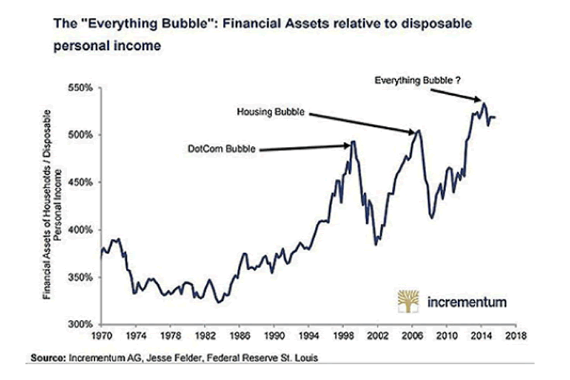 The third core element of this Fourth Turning has thus far been the component temporarily concealing the foulest aspect of this ongoing crisis. The Deep State and their financiers at the Fed and Too Big To Trust Wall Street banks have propped up a debt saturated failing financial system with tens of trillions in additional debt. By artificially suppressing interest rates; rigging stocks, currencies and precious metals through the shadowy derivatives market and dark pools; and providing free money to Wall Street bankers, they have purposely created the largest bubble in world history in stock, bond and real estate markets simultaneously. The “Everything Bubble” puts all other bubbles to shame. Just the slowing of debt creation is beginning to reveal cracks in the system.