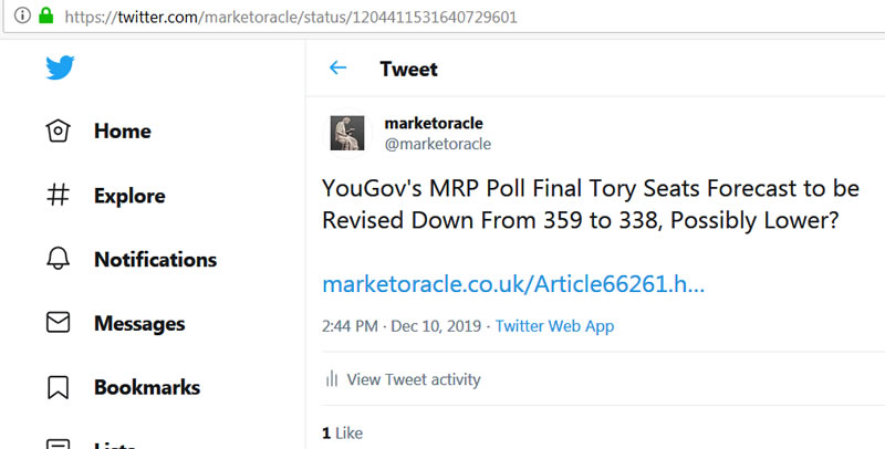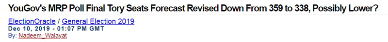 YouGov updated their MRP methodology based election seats forecast at 10pm on Tuesday 10th December. Their existing forecast as of 27th November was for Boris Johnson to win a majority of 68 on 359 seats, whilst Labour dropping from 242 to 211. As apparently Yougov accurately called the June 2017 General Election? We'll that's what Yougov and the mainstream press keep iterating and thus the obsession with their MRP forecast for the whole of the 2019 campaign, generating much free publicity for the pollster.