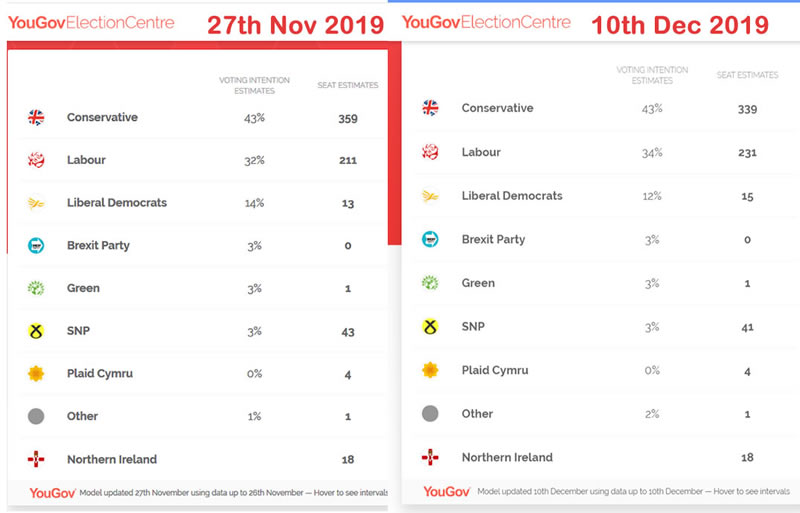 The only things that's changed is that the Tories have hoovered up Brexit Party votes whilst Labour has hoovered up Lib Dem support. Hence little net difference. At the time this typically resolved to a Tories seats forecast range of 342 to 376 seats.