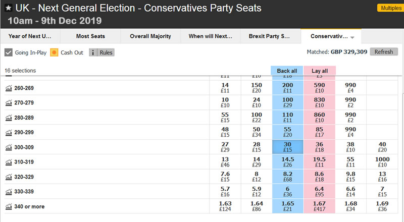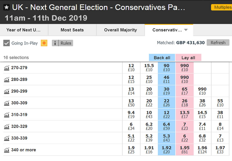 The current state of the betting markets have tightened in the most probable ranges following the Yougov MRP poll that slashed 20 seats off their expected Tory tally. With my core range 320-329 tightening from 8.2 to 6.4. The hedge range of 310-319 falling from 14.5 to 12. And the other hedge bet of 330-339 also tightening from 6 to 5.3. Though all still offer decent risk vs rewards i.e. the core range of 320-329 would resolve in a £10 bet resulting in a £54 profit (plus stake).
