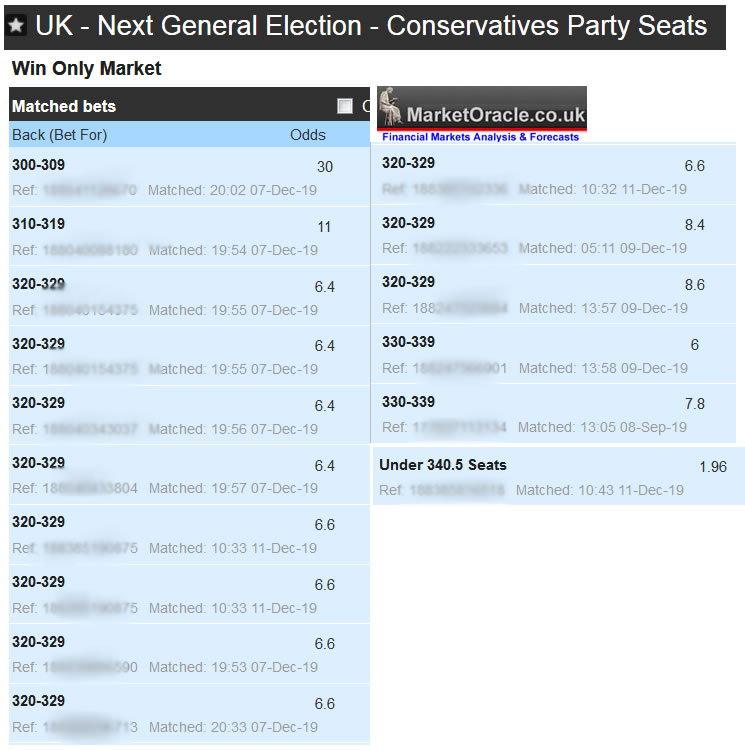 Whilst my forecast expectation is for 320-329. However, as is the case when trading markets, it can be wise to hedge positions when opportunities present themselves. For instance the next most probable ranges are 310-319 and 330-339, which are still offering decent hedging odds. To illustrate how I have hedged this election then here is a list of all of my open bets placed mostly over the past week with one popular betting site, which also illustrates the point that I do tend to put my money where my mouth is so if my forecast proves wrong then I WILL LOSE MONEY!