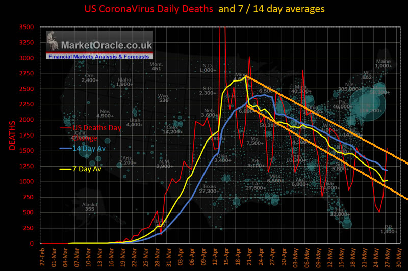 Similarly to the UK, the daily deaths remains on a volatile downwards trend trajectory with the 7 day deaths moving average currently standing at 1024, down from a peak of 2696. Whilst the 14 day moving average stands at 1183 down from a peak of 2405, for a spread of 159. Where even if this trend persists suggests that the US is still a good 3 weeks away from when the US should consider relaxing lockdown's else risk triggering a trend to a significant second peak. Still the overall trend is in the right direction which goes some way to explain the stock markets shoulder shrug response to the pandemic as so far an expected correction of about 14% has largely failed materialise.
