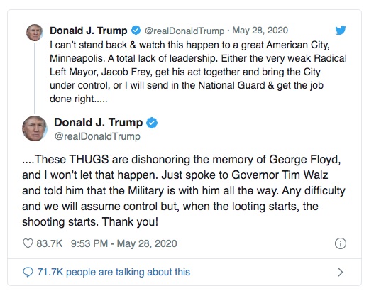 President Trump appeared to fan the flames, and suggested a violent confrontation was imminent, with his statement “When the looting starts, the shooting starts” - a controversial phrase pinched from a Miami police officer who said it during a civil rights protest.