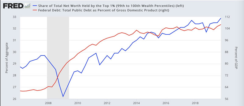 The Fed has created the largest wealth gap in U.S. history and bears responsibility for the approaching civil war and eventual financial collapse of our debt saturated system. The money (debt) creation doesn’t actually benefit the 1%, but the .1% – funneled directly into their ever increasing bank accounts.